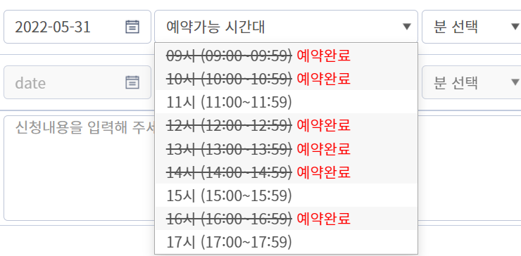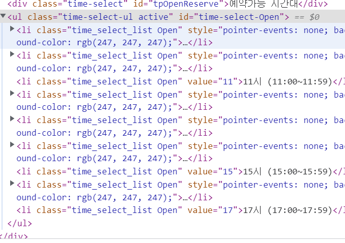 let element = '<li class="time_select_list Put" value=' + hour + '><span class="line-through selectedhour">' + hour + '시 (' + hour + ':00~' + hour + ':59)</span> <span class="txc_red">선택함</span></li>'