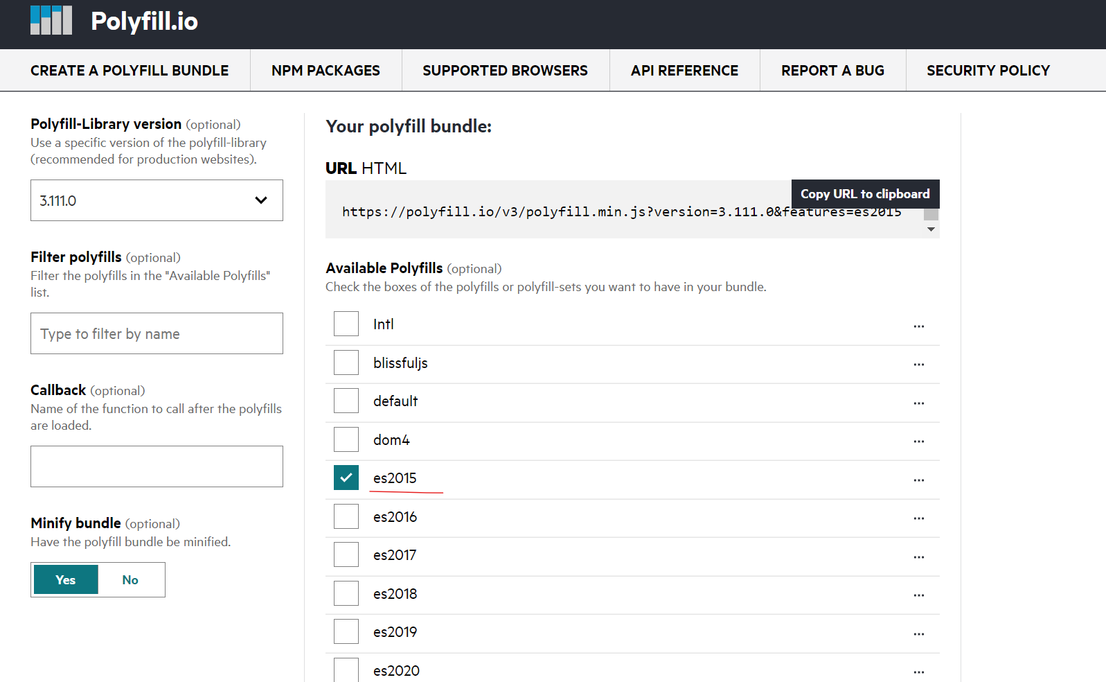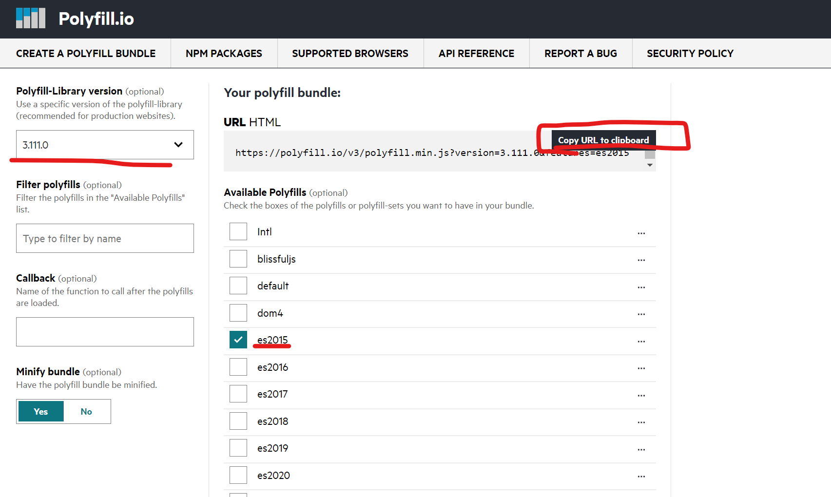 해당 사이트에서 해당하는 폴리필들을 선택하고 Copy URL 을 한뒤 Script 최상단에 넣습니다.