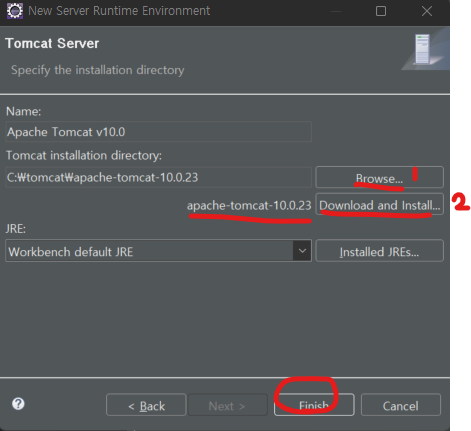 1. Tomcat 10v 를 미리 설치하였다면 Browse 선택하여 해당 경로에 위치시키고 finish 선택