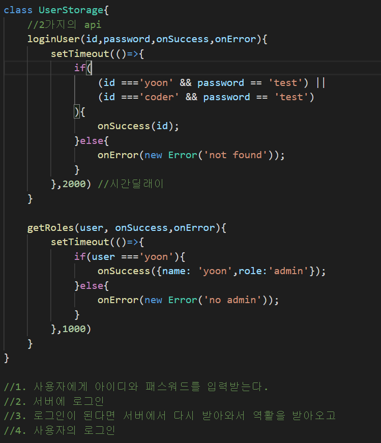 yoon이라는 이름 또는 coder 라는 이름이 각각 id와 password가 지정된 값이 맞으면 resolve를 반환