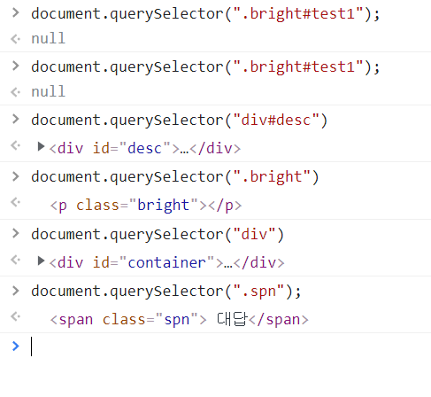단순 dom에 접근하려면 (queryselector은 최상단의 것만) "" 안에 태그를 적으면 접근이 가능하다.