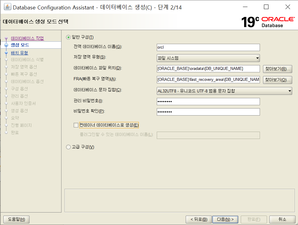 2. 컨테이너 데이터베이스 생성 체크를 풀고 입력