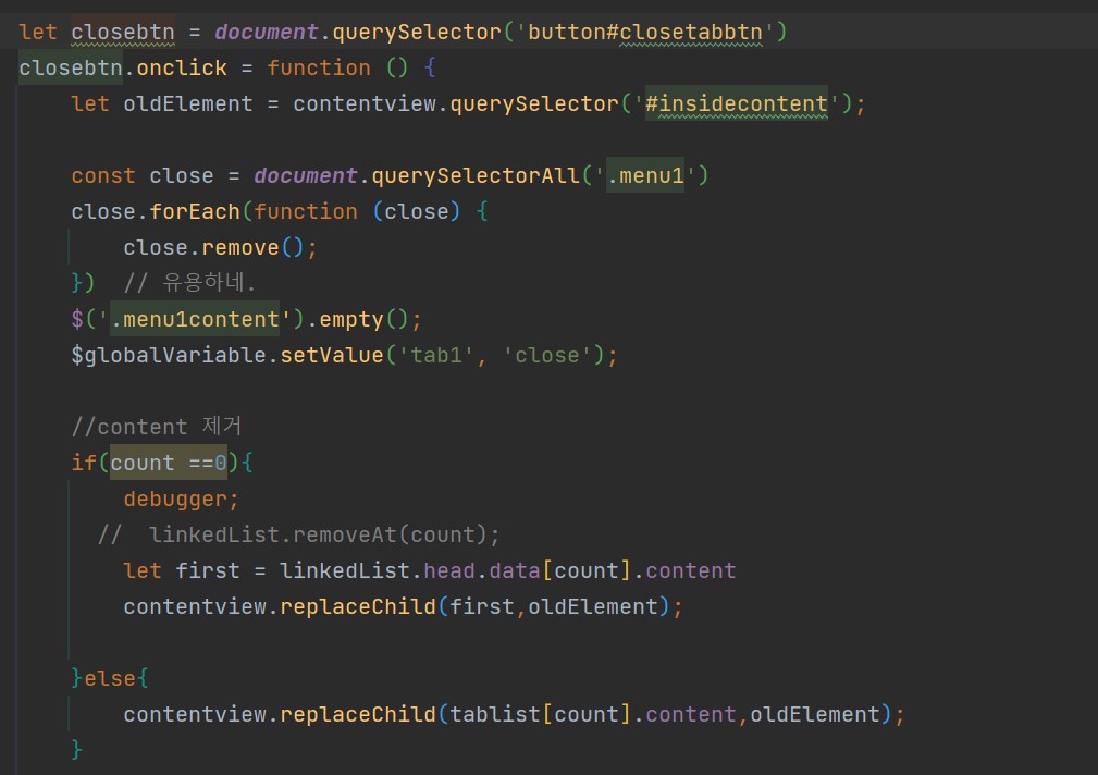 위의 상황에서는 메뉴2번이 먼저 들어오고 메뉴 1번이 들어왔습니다. 그리고 마지막에 3번이 오면서 연결구조에 저장은 되었으나. 메뉴 1을 닫기를 클릭하는 순간 메뉴 1이 기억하고 있는 앞의 content인 메뉴 2의 내용이 출력되게 됩니다.