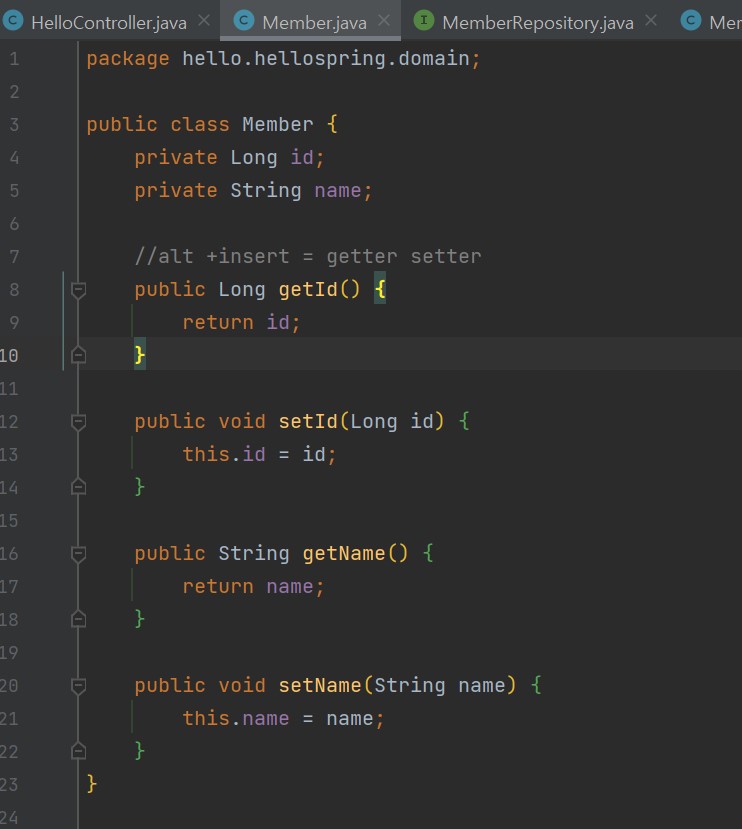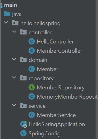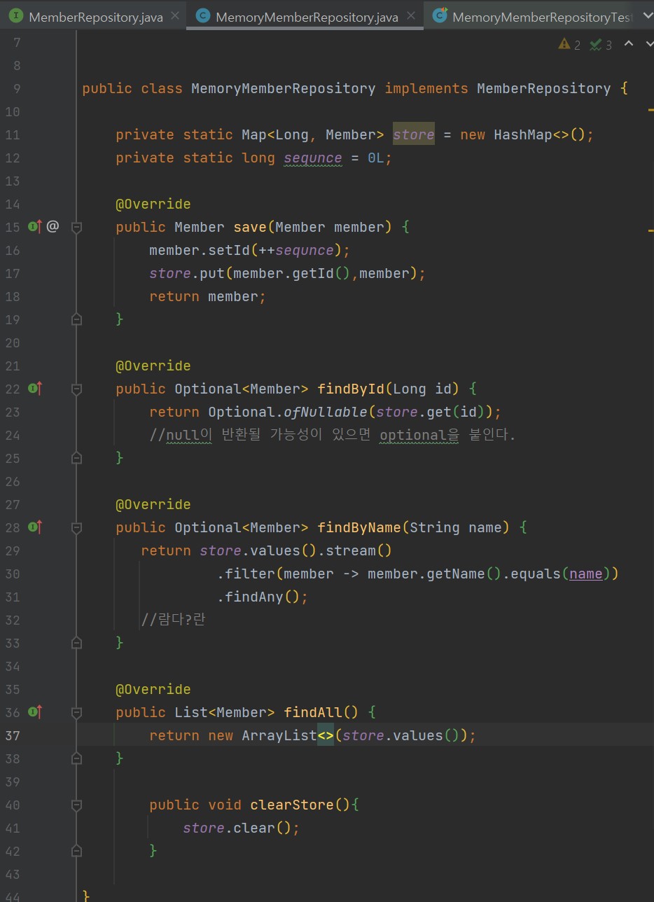 도메인인 Member 클래스를 받아서 인터페이스 함수를 설정합니다. 그에 맞는 기능은 MemoryMemberRepository.java 에 구현합니다